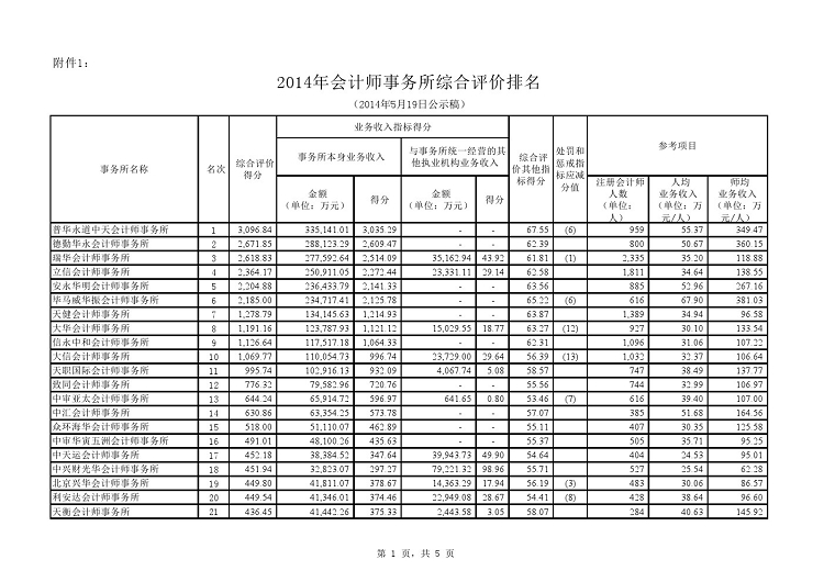 附件: 1. 2014年会计师事务所综合评价前百家信息(公示稿)