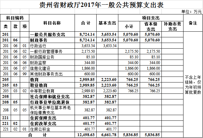 2017年一般公共预算支出总额12,498.63万元,其中:基本支出6,661.78万元,占一般公共预算支出总额的53.31%;项目支出5,836.85万元,占一般公共预算支出总额的46.69%。基本支出中行政运行支出为3,653.54万元;中等职业教育支出为2,223.6万元;机关事业单位基本养老保险缴费支出382.87万元;住房公积金支出401.77万元。项目支出中一般行政管理事务支出2,175.5万元;财政国库业务支出85.1万元;财政监察支出344万元;信息化建设支出1,866万元;其他财政事务支出600万元。中等职业教育支出766.25万元。
