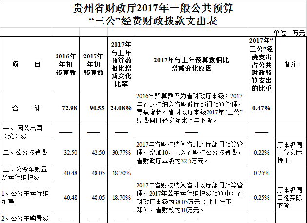 2017年一般公共预算“三公”经费支出预算为90.55万元,比2016年增加17.57万元,其中:公务接待费增加10万元、公务车运行维护费增加7.57万元。原因是省财政学校作为体验金
