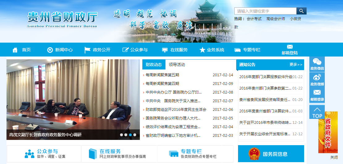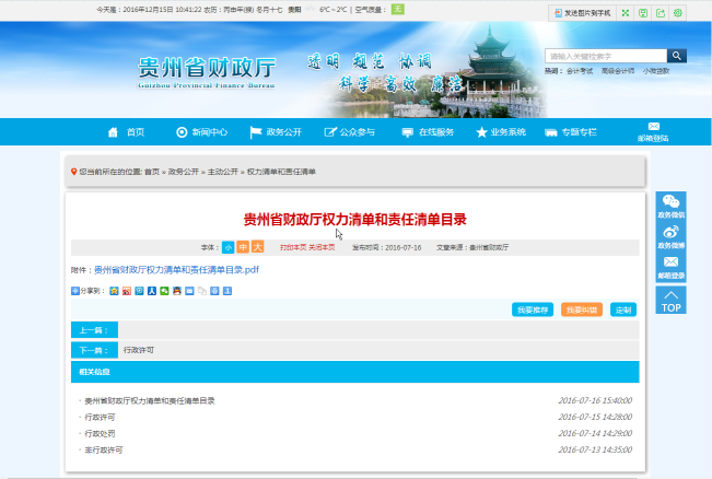 一是根据省政府要求进行行政审批事项清理工作,保留了4项行政审批权和71项行政处罚权,继续完善行政许可事项和非行政许可事项权力运行流程,制定详细的行政审批标准,通过省政府法制办统一向社会公布基础上,及时在体验金 门户网站进行公布。行政审批项目包括:会计师事务所及其分支机构设立的审批、境外会计师事务所来内地临时办理审计业务审批、合作企业合同约定外国合作者在缴纳所得税前回收投资的批准、中介机构从事代理记账业务审批。行政审批涉及到的办事指南均发布在贵州省网上办事大厅,其中涉及到会计事项办理的同时发布在体验金 子网站——贵州省财政会计网上。体验金 行政处罚事项71项,主要包括对不依法设置、私设会计账簿的行为处罚、对违反财政收入票据管理规定的行为的处罚等项目。二是实行审批依据、审批材料、审批程序“三公开”,上墙公布政府采购、非税收入和票据管理等事项的办理要求及流程;对行政审批事项的审批时限进行主动告知和公开承诺,缩短办理时限,会计师事务所设立审批公开承诺15个工作日内办结(法定期限45个工作日)。三是发挥省政府政务服务中心窗口职能,及时处理我厅行政审批服务事项。2016年所有会计师事务所及分所设立审批的受理和发证均按要求在政务服务中心窗口进行,共办理8项行政审批,其中合作企业合同约定外国合作者在缴纳所得税前回收投资的批准4项,会计师事务所设立审批4项。四是严格依法依规开展财政监督检查工作,不断完善财政监督政务公开制度,做到查前公示、查后公告,加大对财政监督检查结果和处理处罚情况的公开曝光力度,把公开透明贯穿于财政监督工作全过程。2016年在会计监督检查中共对4家行政事业单位和2家会计师事务所进行了行政处罚。五是2016年体验金 在官方网站常态公布并实时更新《贵州省行政事业性收费目录清单》《贵州省涉企行政事业性收费目录清单》、《贵州省政府性基金目录清单》,在全国率先创新公布《贵州省涉煤政府性基金、行政事业性收费目录清单》,并公告目录清单之外的政府性基金和行政事业性收费,一律不得执行,公民、法人和其他组织有权拒绝缴纳。2016年,分别于1月8日、4月29日、11月10日、12月21日分别对目录清单内容进行了4次更新。六是不断完善和规范省对下一般性转移支付资金安排和分配办法,实行“因素法”分配并将测算的全部因素、权重和计算过程、分配结果在全省财政内网上公开。开设“政府和社会资本合作(PPP)”、“四在农家.美丽乡村小康寨行动计划”、“贵州财政惠民政策明白卡”、“贫困县涉农资金整合”等重点领域政务公开专题专栏,及时公母相关信息,加强资金管理和监督。