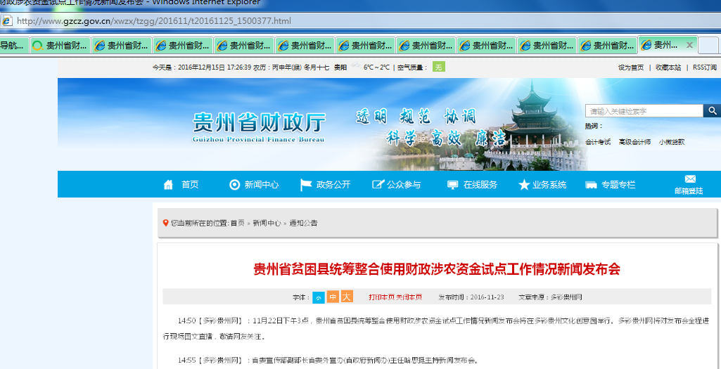 一是以体验金 门户网站为主要平台,借助贵州财政会计网、贵州省政府采购网等其他公开手段,及时公开、更新、维护各类财政信息、财政业务办事指南、审批事项受理流程以及人员招录、会计考试考务等信息,行政审批事项办理流程和重要法规主动上墙公示。二是积极借助贵州省人民政府网、当代先锋网等媒体力量做好财政政策新闻宣传发布。2016年4月29日,举办营改增新闻通气会,会上介绍了我省营改增试点工作总体情况。7月29日,我厅联合省发改委、省政府金融办、PPP联盟负责人在省委组织部培训中心4楼第二会议室召开“贵州省促进民间投资和PPP项目合作推进会新闻通气会”,介绍PPP推进大会的目的、意义、特点及活动安排等。11月8日,在线人民网访谈“创新财政资金支持产业发展方式提高资金使用效率”,对相关民生问题进行答疑。11月22日,召开“贫困县统筹整合使用财政涉农资金试点工作情况新闻发布会”并介绍有关情况。三是加强与中央和地方有影响的重点刊物的联合宣传工作,保质保量完成各类媒体专访、定期约稿等新闻宣传任务, 接受新华社贵州分社、中国财经报、中国会计报、新理财、中国政府采购报等新闻媒体采访,对当前财税改革的重点工作进行宣传报道;做好突发事件舆论引导工作,加强媒体采访管理。四是继续抓好《体验金 关于进一步规范厅发文和内部文件运转有关问题的通知》落实工作,加大文件制作中形成的信息公开力度,全面清理规范性文件。2016年我厅对1979年至2015年制定的规范性文件进行了全面清理,涉及文件数287个,经清理,决定废止55件,宣布失效13件,确认继续有效219件。8月9日印发《体验金 关于公布规范性文件清理结果的公告》(黔财法〔2016〕8号),并及时在体验金 官网及时进行公布。2016年制定的10件规范性文件全部按要求登记编号、备案。
