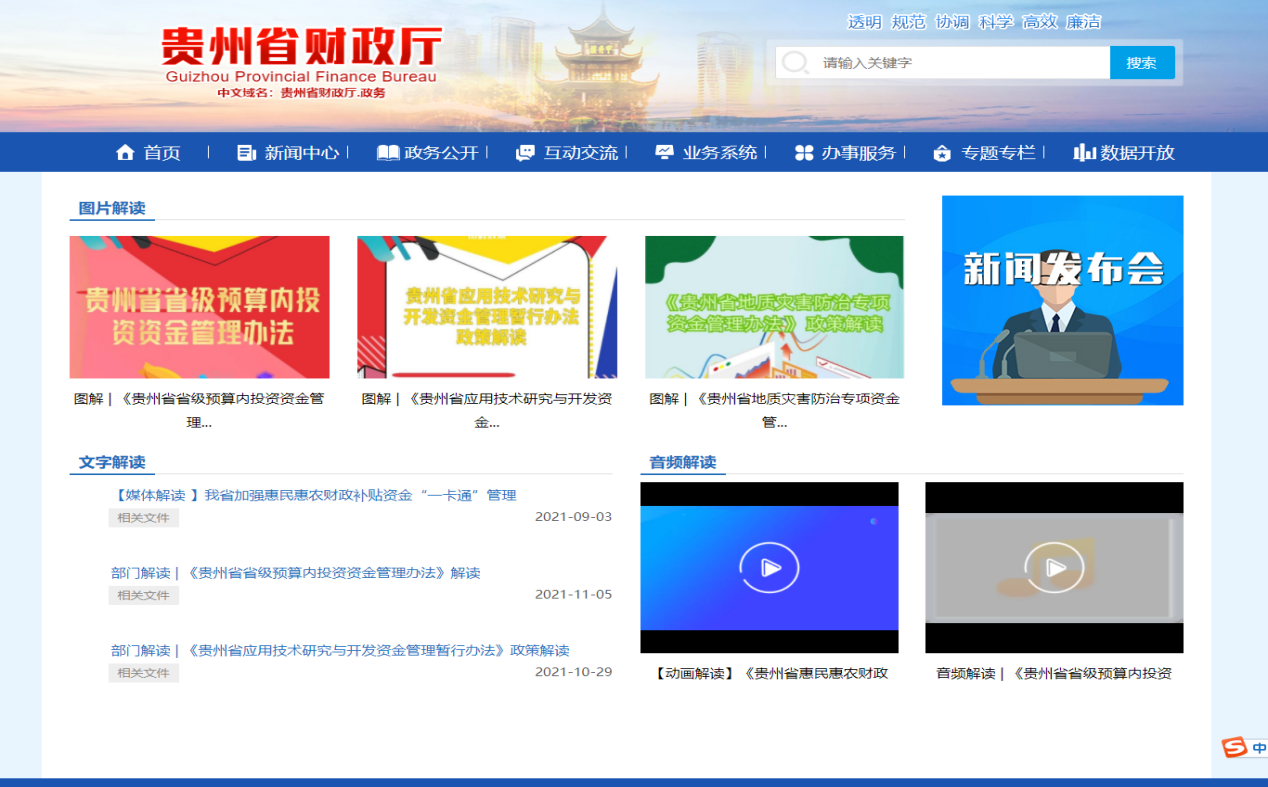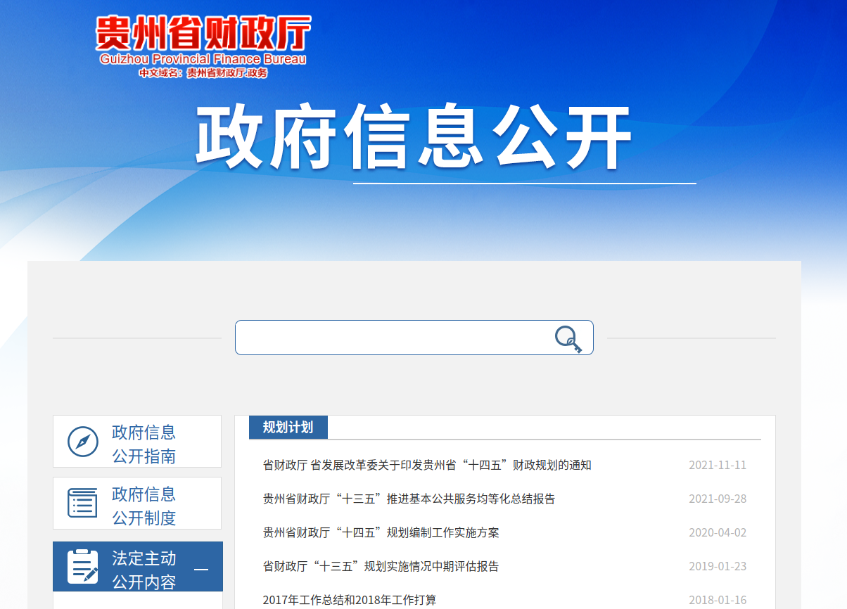 (一)推进政府信息主动公开。在体验金 门户网站主动公开行政法规和规范性文件;主动公开并及时更新机构职能、基本信息、领导信息等;主动公开贵州省“十四五”财政规划信息;主动公开办事服务事项及其依据、条件、程序以及办理结果;增设“行政执法”栏目,主动公开2021年本单位行政处罚决定;主动公开贵州省财政预决算信息,开设专栏将财政预决算领域公开事项分为四大类,包括省本级财政预决算、省有关部门(单位)财政预决算、省直部门所属单位财政预决算、各市州财政预决算;主动公开《贵州省行政事业性收费目录清单》《贵州省涉企行政事业性收费目录清单》等行政事业性收费项目及其依据、标准;主动公开乡村振兴、教育、医疗、社会保障、促进就业等方面的财政政策;主动公开贵州省财政学校招考的职位、名额、报考条件等事项以及录用结果信息。通过贵州省政府采购网主动公开政府采购目录、标准及实施情况等信息。