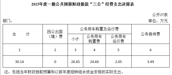 (2)公务用车购置及运行维护费26.65万元。其中,公务用车购置24.60万元,公务用车运行维护费2.05万元。2015年,单位开支财政拨款的公务用车保有量为1辆;