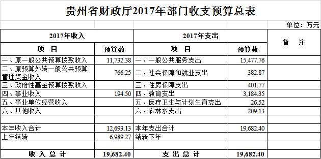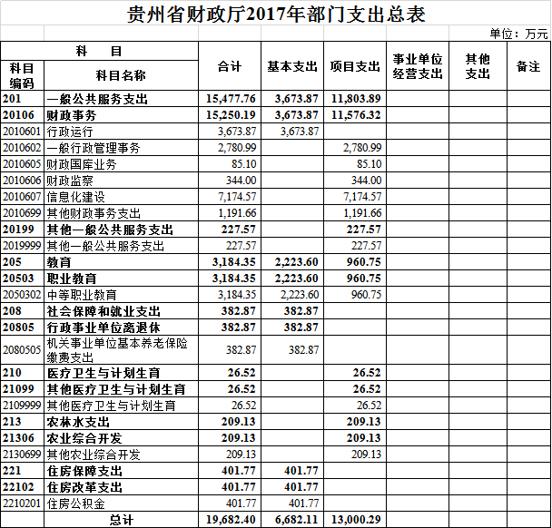 2017年支出预算总额为19,682.40万元。其中:基本支出6,682.11万元,占2017年部门支出的33.95%;项目支出13,000.29万元,占2017年部门支出的66.05%。基本支出主要是人员经费及用于保障厅机关及所属事业单位、省财政学校等机构正常运转、完成日常工作任务的支出,具体为行政运行支出3,673.87万元,占总支出的18.67%;中等职业教育支出2,223.60万元,占总支出的11.3%;机关事业单位基本养老保险缴费支出382.87万元,占总支出的1.95%;住房公积金支出401.77万元,占总支出的2.04%。项目经费用于厅机关及下属事业单位、省财政学校为完成特定的行政工作任务或事业发展目标而开展的专项工作经费支出,具体为一般行政管理事务支出2,780.99万元,占总支出的14.13%;财政国库业务支出85.1万元,占总支出的0.43%;财政监察支出344万元,占总支出的1.75%;信息化建设支出7,174.57万元,占总支出的36.45%;其他财政事务支出1,191.66万元,占总支出的6.05%;其他一般公共服务支出227.57万元,占总支出的1.16%;其他医疗卫生和计划生育支出26.52万元,占总支出的0.13%;其他农业综合开发支出209.13万元,占总支出的1.06%;中等职业教育支出960.75万元,占总支出的4.88%。
