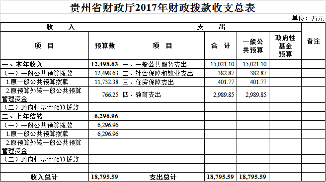 2017年一般公共预算财政拨款总收入为18,795.59万元,其中:本年收入12,498.63万元,占财政拨款总收入的66.5%;上年结转6,296.96万元,占财政拨款总收入的33.5%。2017年一般公共预算财政拨款支出18,795.59万元,其中:一般公共服务支出15,021.10万元,占财政拨款支出的79.92%;社会保障和就业支出382.87万元,占财政拨款支出的2.04%;住房保障支出401.77万元,占2.14%;教育支出2,989.85万元,占财政拨款支出的15.91%。
