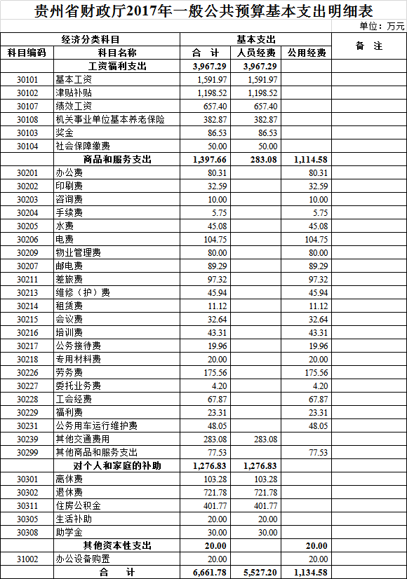 2017年一般公共预算基本支出为6,661.78万元,其中人员经费5,527.20万元,占一般公共预算基本支出的82.97%;公用经费1,134.58万元,占一般公共预算基本支出的17.03%。人员经费主要是工资福利支出和对个人和家庭的补助及其他交通费用,其中:工资福利支出3,967.29万元,占人员经费的71.78%;对个人和家庭的补助支出1,276.83万元,占人员经费的23.1%;其他交通费用支出283.08万元,占人员经费的5.12%。公用经费主要是商品和服务支出和其他资本性支出,其中:商品和服务支出1,114.58万元,占公用经费的98.24%;其他资本性支出20万元,占公用经费的1.76%。