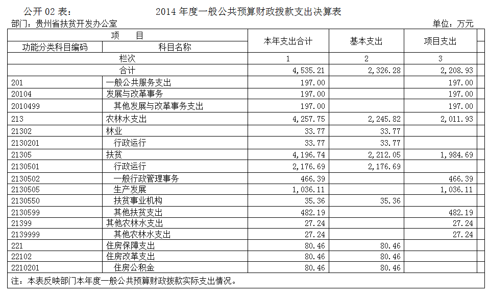 贵州省扶贫开发办公室2014年度一般公共财政预算拨款支出总计4535.21万元,按功能分类情况是: