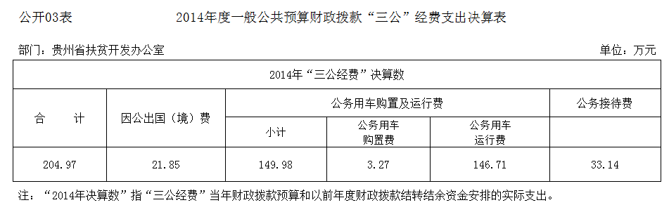 贵州省扶贫开发办公室2014年度一般公共财政预算拨款“三公”经费决算支出204.97万元,占总支出的4.51%。其中: