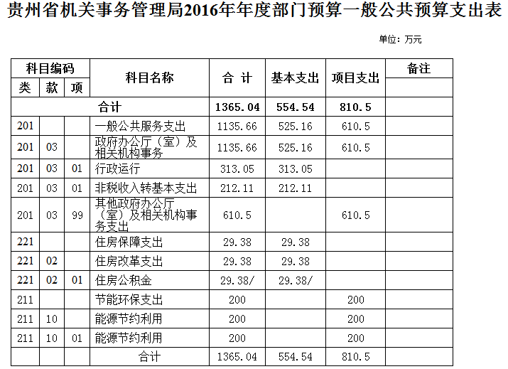 贵州省机关事务管理局2016年部门预算1365.04万元。包括:(1)一般公共预算支出1152.93万元,其中:基本支出342.43万元,占预算资金的25%;项目支出810.5万元,占预算资金的59%;(2)原预算外转一般公共预算管理非税收入安排支出212.11万元,占预算资金的16%。