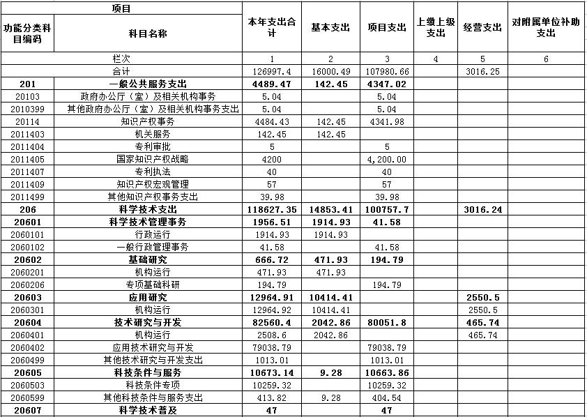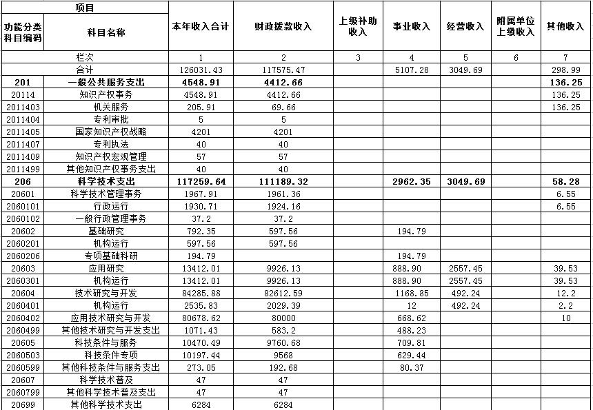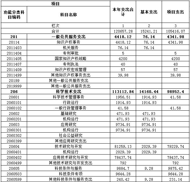 (2)206(类)科学技术支出113112.84万元,占财政拨款支出的93.75%,主要用于基础研究、应用研究、技术研究与开发、科技条件与服务、科学技术普及、科学技术管理事务、其他科学技术支出等科学技术方面的支出。