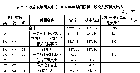 2016年,财政部门核定的收入和支出预算均为1271.89万元,均为省本级的财政预算拨款收入和支出。注:中心属于财政全额拨款单位,收入全部来自财政拨款,收支预算按年核定和使用,故收入和支出预算相等。具体情况见表1。