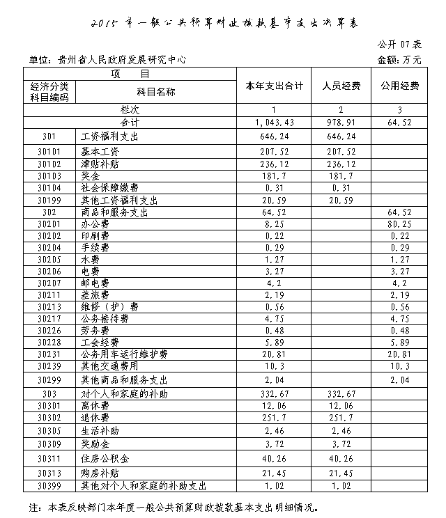 2015年,中心一般公共预算财政拨款基本支出1043.43万元,其中:人员经费978.91万元,主要包括基本工资、津贴补贴、考核目标奖、离退休费、其他工资福利支出等;公用经费64.52万元,主要包括办公费、印刷费、水电费、差旅费、公务接待费、公务用车运行维护费、工会经费等。具体情况见公开07表。