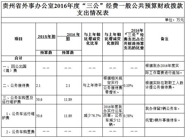 根据中央及省委、省政府相关规定严控“三公经费”的支出。我办的“三公经费”主要用于这几方面:(一)公务接待费由外事接待费和国内接待费这两部分构成,其中国内接待费根据在职人员的人数从公用经费中计提,2016年度国内接待费预算2.1万元,外事接待费根据当年的外事接待工作进行支出,我办负责全省省级外宾、党宾、华人华侨、港澳同胞的因公外事接待工作。(二)因公出国(境)费用:根据当年的实际工作情况进行追加拨款,我办负责主要省领导的因公出国(境)费用申请和支出。(三)公务用车购置及运行维护费:公车改革后我办仍保留3辆外事接待用车和5辆公务用车共8辆车,运行维护费预算11.89万元,公车改革后车辆减少12辆,运行维护费减少38.71万元。