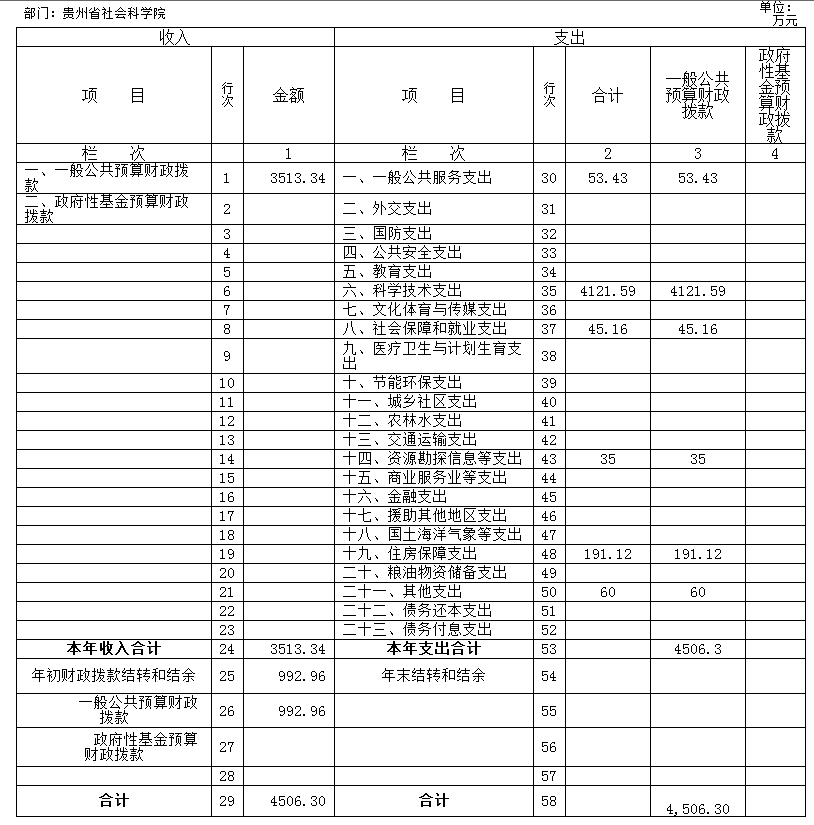 2016年我院收入预算总额为4506.30万元,含:2015年结转992.96万元,2016年当年贵州省社会科学院财政补助拨款收支预算3513.34万元。