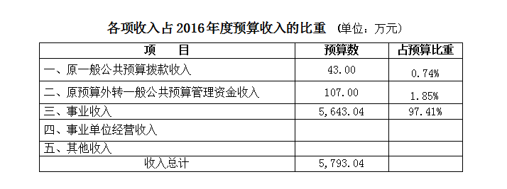 2016年,收入预算总额5793.04万元,其中原一般公共财政预算拨款收入43万元,原一般公共财政预算管理资金收入107万元,专户管理非税收入5643.04万元。收入支出预算表见下: