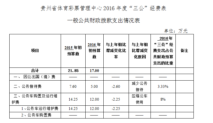 公共预算支出“三公”经费占2016年公共预算支出11.33%,其中“公务接待费”占有公共预算支出比重3.33%;“公务车运行维护费” 占有公共预算支出比重8%。