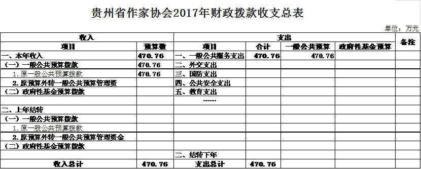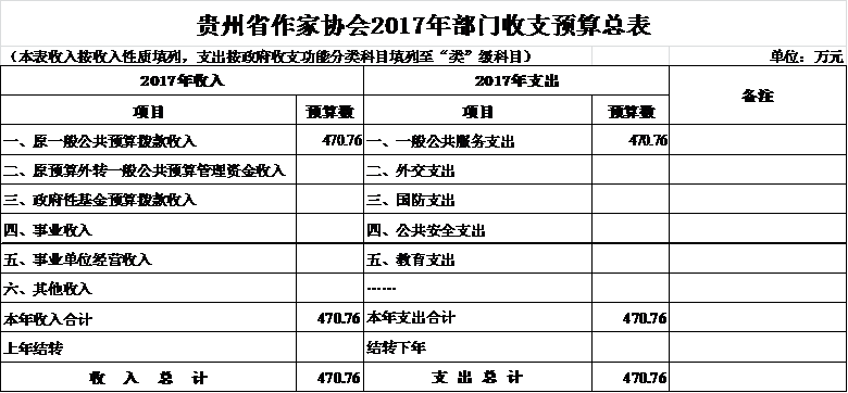 贵州省作家协会2017年收入470.76万元。其中:原一般公共预算拨款收入470.76万元。贵州省作家协会为2017年新增预算单位,无上年结转资金。2017年支出470.76万元。其中:一般公共服务支出470.76万元,无结转下年资金。