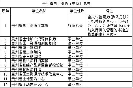 纳入贵州省国土资源厅2016年部门预算编制范围的单位共12家,详见下表: