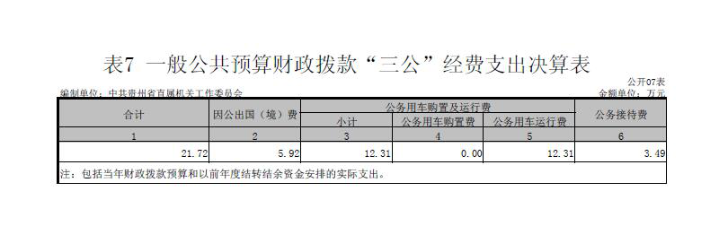(七)中共贵州省直属机关工作委员会2016年度一般公共预算财政拨款“三公”经费支出决算情况说明2016年度“三公”经费一般公共预算财政拨款支出决算21.72万元,比上年减少34.22万元,降低61.17%,减少原因是严格按照省委、省政府规定压缩“三公”经费开支。其中,因公出国(境)费支出5.92万元,占27.26%,比上年减少1.63万元,降低21.58%,减少原因是出国(境)人员数减少;公务用车购置及运行维护费支出12.31万元,占56.66%,比上年减少31.98万元,降低72.21%,减少原因是公车改革制度,减少了公车的使用频率;公务接待费支出3.49万元,占16.08%,比上年减少0.61万元,降低14.95%,减少原因是减少公务接待活动,按照接待标准执行。具体情况如下: