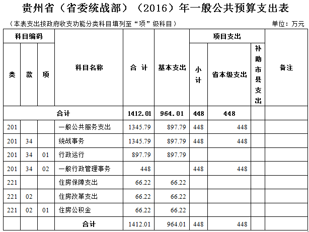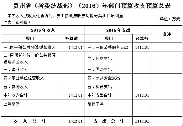 省委统战部2016年收入预算总额为1,412.01万元,均为一般公共预算拨款收入,占比100% 。相应安排支出预算1,412.01万元。