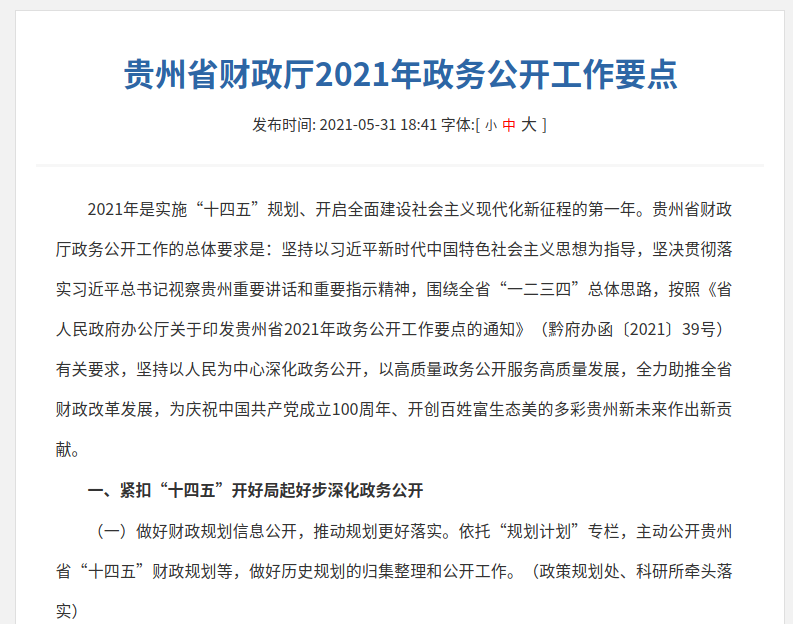 (一)推进政府信息主动公开。在体验金 门户网站主动公开行政法规和规范性文件;主动公开并及时更新机构职能、基本信息、领导信息等;主动公开贵州省“十四五”财政规划信息;主动公开办事服务事项及其依据、条件、程序以及办理结果;增设“行政执法”栏目,主动公开2021年本单位行政处罚决定;主动公开贵州省财政预决算信息,开设专栏将财政预决算领域公开事项分为四大类,包括省本级财政预决算、省有关部门(单位)财政预决算、省直部门所属单位财政预决算、各市州财政预决算;主动公开《贵州省行政事业性收费目录清单》《贵州省涉企行政事业性收费目录清单》等行政事业性收费项目及其依据、标准;主动公开乡村振兴、教育、医疗、社会保障、促进就业等方面的财政政策;主动公开贵州省财政学校招考的职位、名额、报考条件等事项以及录用结果信息。通过贵州省政府采购网主动公开政府采购目录、标准及实施情况等信息。